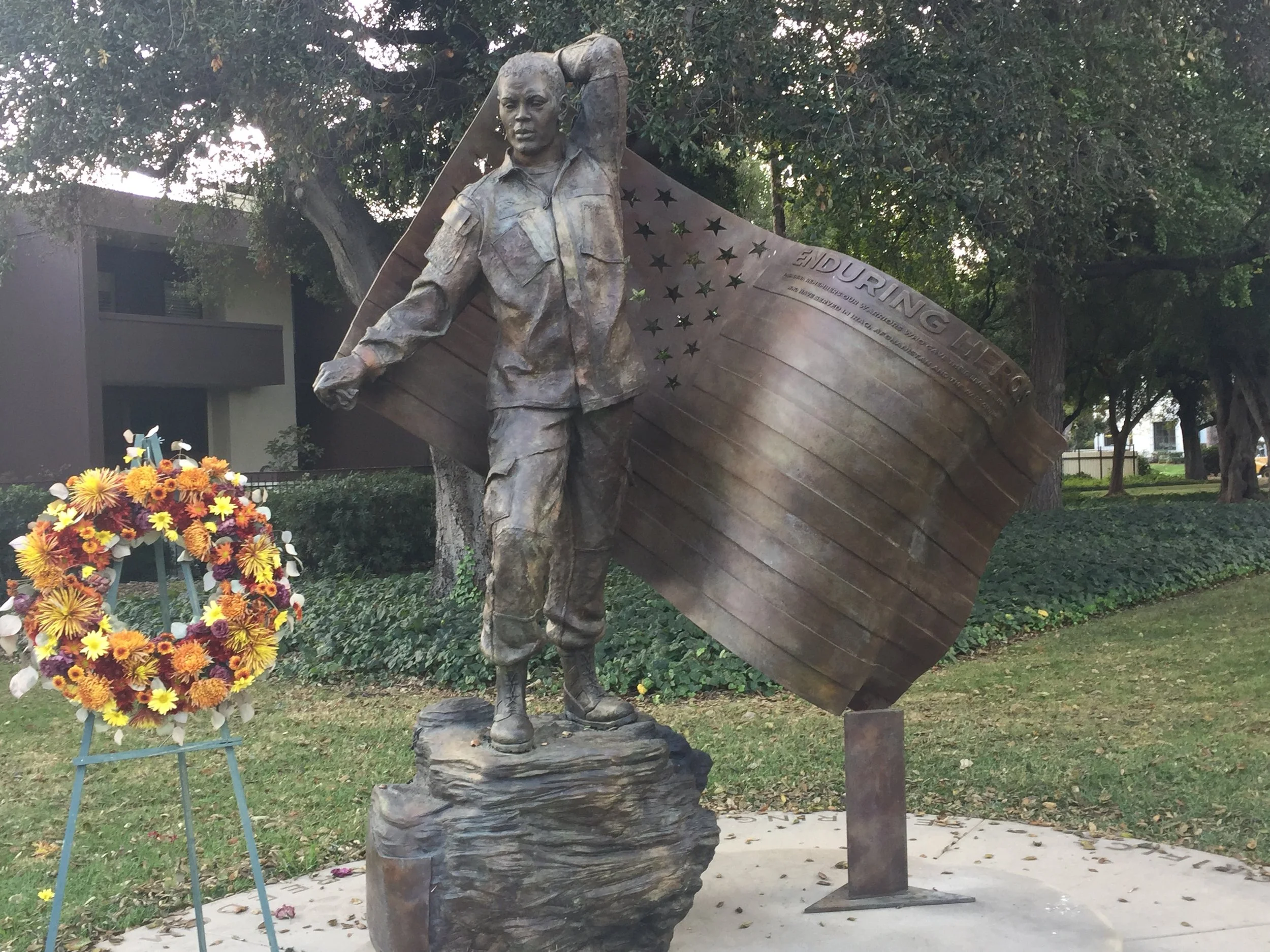 Enduring Heroes tells two stories—one public, one profoundly personal. Facing the Pasadena Memorial Flagpole, a lone soldier raises the American flag in a gesture of duty and remembrance. The flag’s cut-out stars allow light to stream through, forming a luminous halo—a metaphor for sanctity and sacrifice.